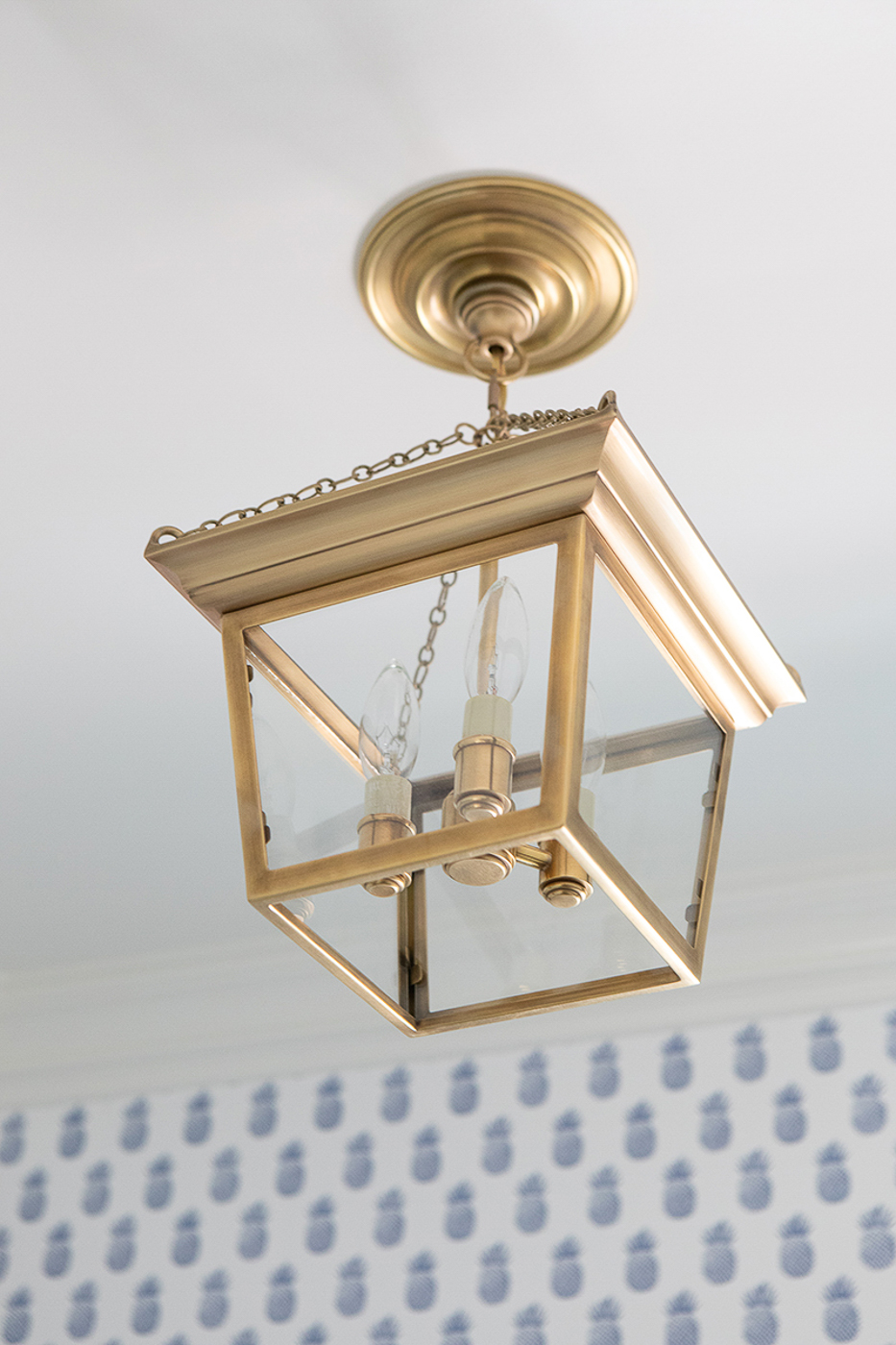 To complement our client’s taste which is the essence of Southern classic – beautiful shades of blue, white, brass and wood tones, we strategically infused these choices throughout the project, with the blue reigning supreme. Loosely veined white quartz countertops, Farrow and Ball’s “Hague Blue” on the island, Visual Comfort’s “Stonington” lanterns over the island and Rejuvenation’s Unlacquered brass hardware were used to bridge the past with the present and create a timeless look for this kitchen addition!